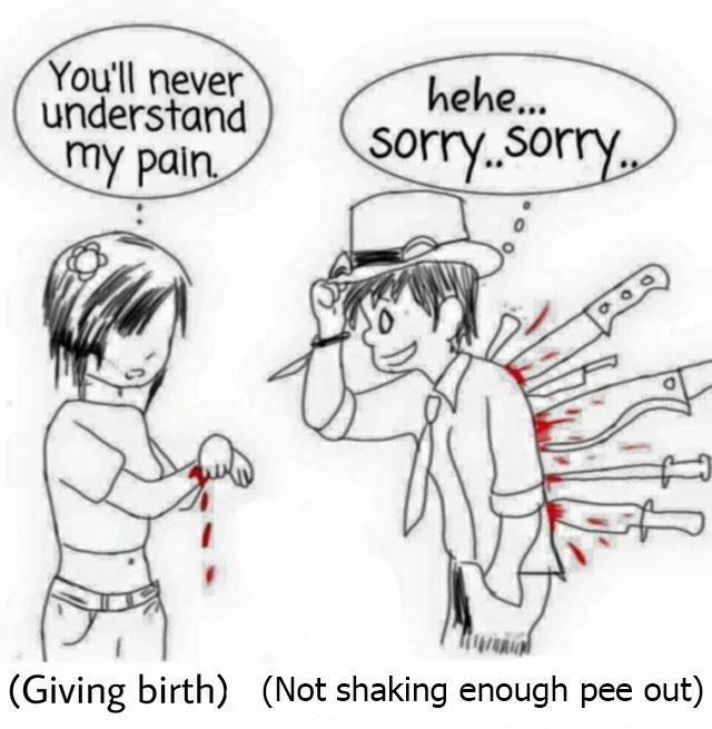 You ll never understand my pain refers to a one panel webcomic showing a woman with a cut on her wrist complaining about her wound to a man with several knives in his back.